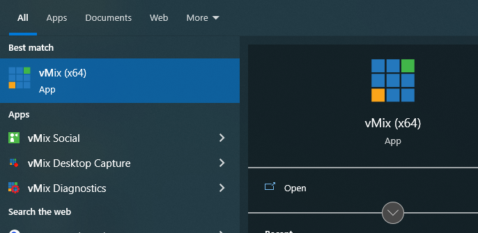You can find vMix by searching for it in the Start Menu or if selected during install, as a desktop icon.
